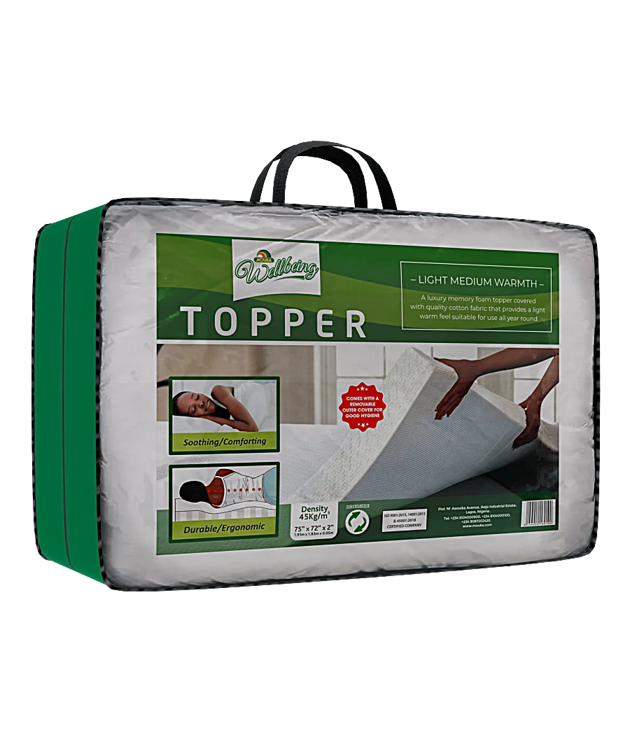 The Mouka Wellbeing Memory Foam Topper is designed to enhance your sleep by adding a soft, adaptive layer to your existing mattress. Its memory foam gently conforms to the body, improving comfort while helping preserve and extend mattress lifespan.